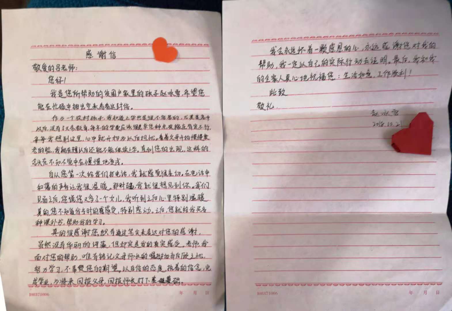 2018年11月3日,青龙陈台子村贫困户赵国利一家人,向公司结对帮扶责任人吕金凤老师赠送一面写有“情暖学子 精准扶贫”的锦旗。他们正在上初中的女儿赵冰雪给吕金凤老师写了一封情真意切的感谢信,一家人真心表达对吕金凤老师三年来对他们真情暖心扶贫助学的感激之情。公司驻陈台子村工作组组长、第一支部书记王伟,公司领导参加了赠送锦旗仪式。