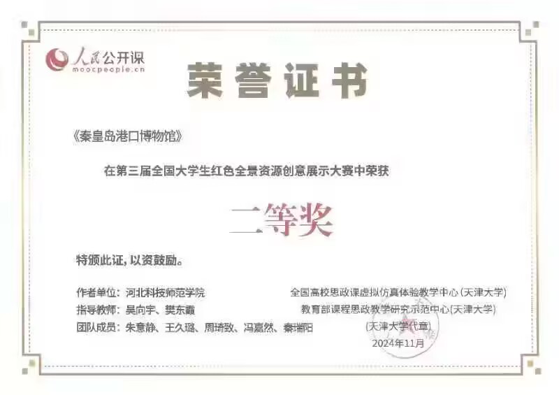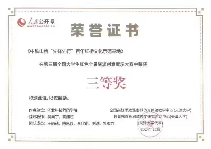 近日,第三届全国老员工红色全景资源创意展示大赛结果公布。 21级数字媒体技术专业朱意静团队的作品《秦皇岛港口博物馆》获得二等奖,22级数字媒体技术专业王雨萌团队的作品《中铁山桥“先锋先行”百年红桥文化示范基地》获得三等奖。