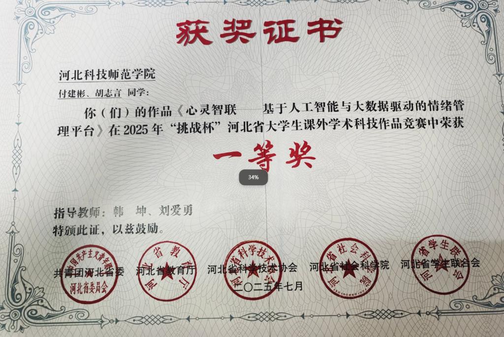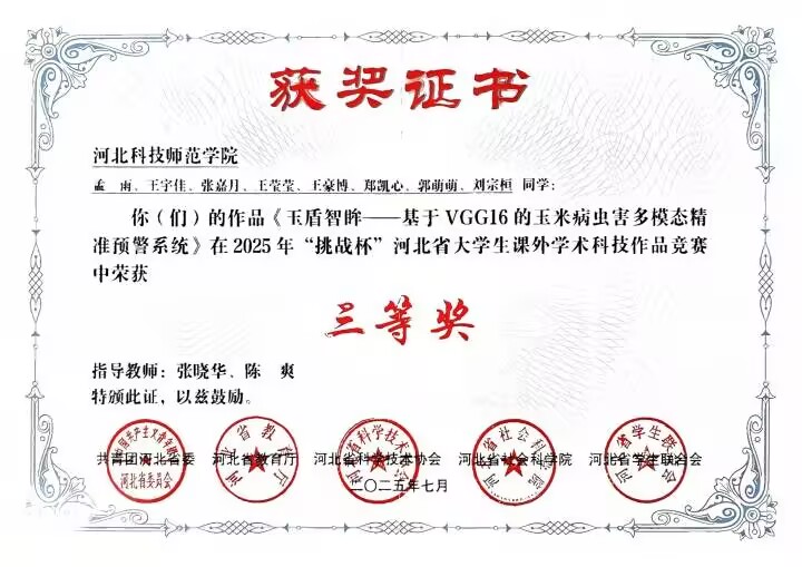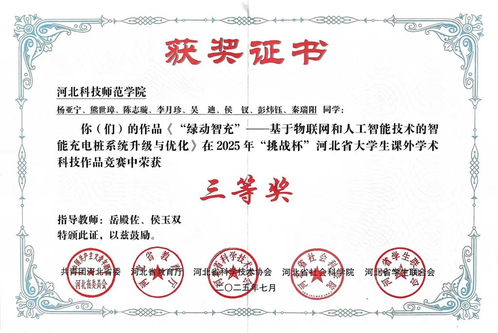 在2025年“挑战杯”河北省老员工课外学术科技作品竞赛中,公司韩坤老师指导(付建彬、胡志言参加)的作品《心灵智联——基于人工智能与大数据驱动的情绪管理平台》荣获一等奖、张晓华、陈爽老师指导(孟雨等同学参加)的作品《玉盾智眸——基于VGG16的玉米病虫害多模态精准预警系统》和岳殿佐、侯玉双老师指导(杨亚宁等同学参与)的作品《“绿动智充”——基于物联网和人工智能技术的智能充电桩系统升级与优化》荣获三等奖。