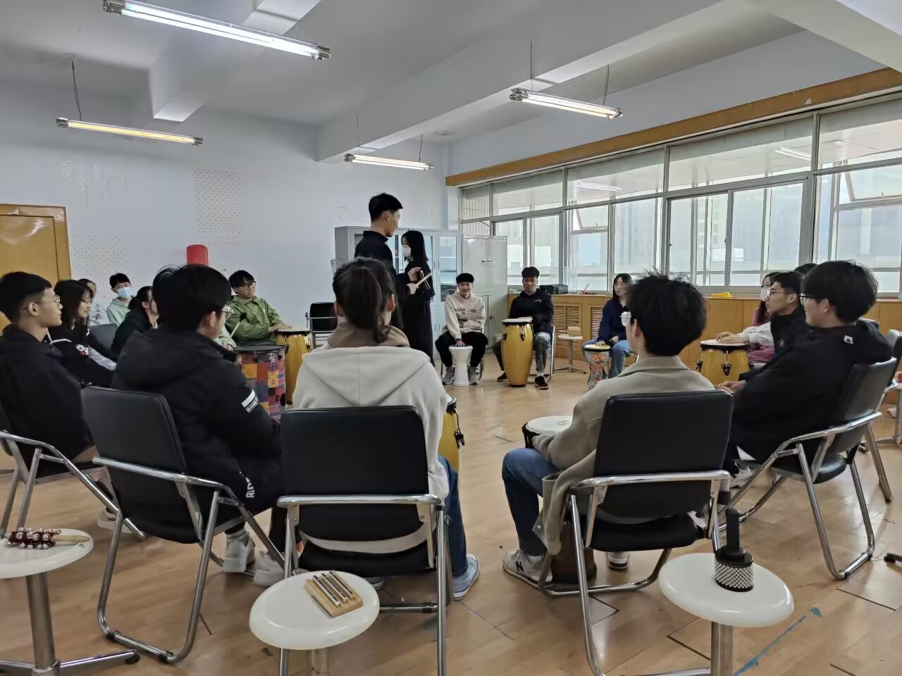 活动分为三个环节。首先是破冰环节,通过趣味自我介绍,消除同学们的紧张和拘束感,加强彼此之间的了解;然后是鼓圈主体活动,同学们通过急切澎湃的鼓乐之声以宣泄情绪,通过自己设计的才艺表演以展示自身魅力,获得勇气;最后通过“你喜欢我吗”的游戏让同学们领悟良好的人际关系和沟通能力在传递正性情绪方面的重要性,使同学们获得疏解负性情绪、缓解压力的技巧。