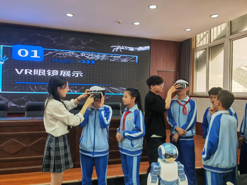 活动现场,团支部成员“科技小导师”,运用专业知识,一边展示AI网页制作的神奇过程,一边通过图文并茂的示例,在手语老师的同步翻译下,耐心地为孩子们拆解操作步骤。智能机器人操控演示环节将气氛推向高潮,孩子们目不转睛,眼中闪烁着好奇与兴奋的光芒。互动环节,孩子们体验了VR设备,并亲自操控机器人做各种不同的动作,他们兴奋地互相交流,虽然无声,却满是对科技探索的热情。