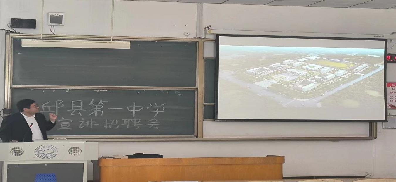 本次招聘会的宣讲人先为我们介绍了关于邱县的历史与公司的文化。邱县第一中学建于1951年,是省级示范性高中,在校生5500人,教职工340余人,是邱县唯一一所普通高级中学。今年9月邱县第一中学南校区正式投入使用。新校区占地213亩,建筑面积约9万平方米,包含教学楼、实验楼、行政综合楼、餐厅、报告厅、风雨操场、体育场、员工公寓、教师公寓等。今年邱县第一中南校区计划招收高一新生30个班,约1500人,现在公司面向全国招聘教师。竭诚欢迎有志青年加盟。