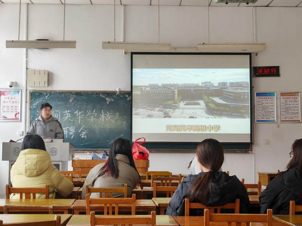 本次招聘会的主讲人袁老师给同学们详细介绍了该公司的情况。河间英华公司是一所高起点、高规格、高品质的现代化公司。此校快速发展,颇受社会各界关注,且其薪资待遇优厚。公司提供教师公寓、老师备课区,文化建设高端大气。公司有教职工食堂,每天都有专职师傅搭配饭菜,营养合理,搭配均衡,半价供应。