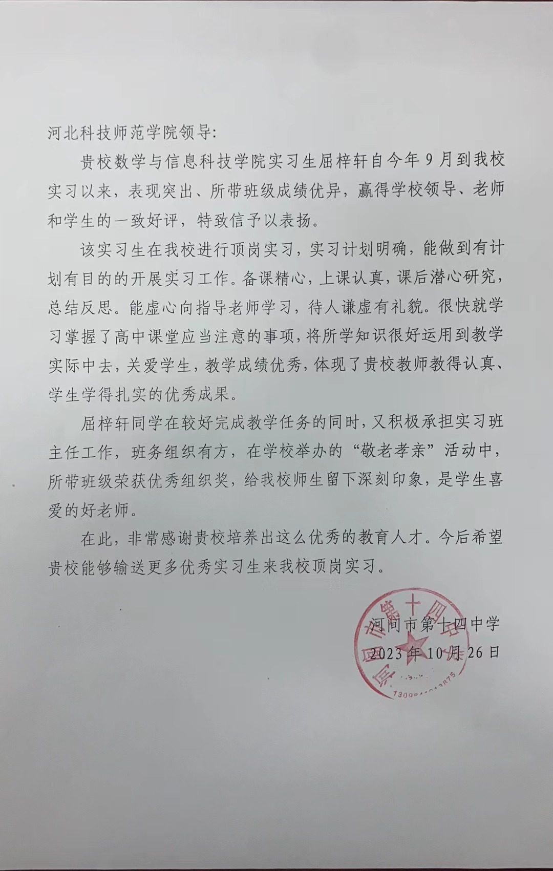 近日,河间市第十四中学向公司发来表扬信,对beats365亚洲版官网数学与应用数学专业屈梓轩同学自今年9月到河间市第十四中学教育实习以来的表现予以表扬。