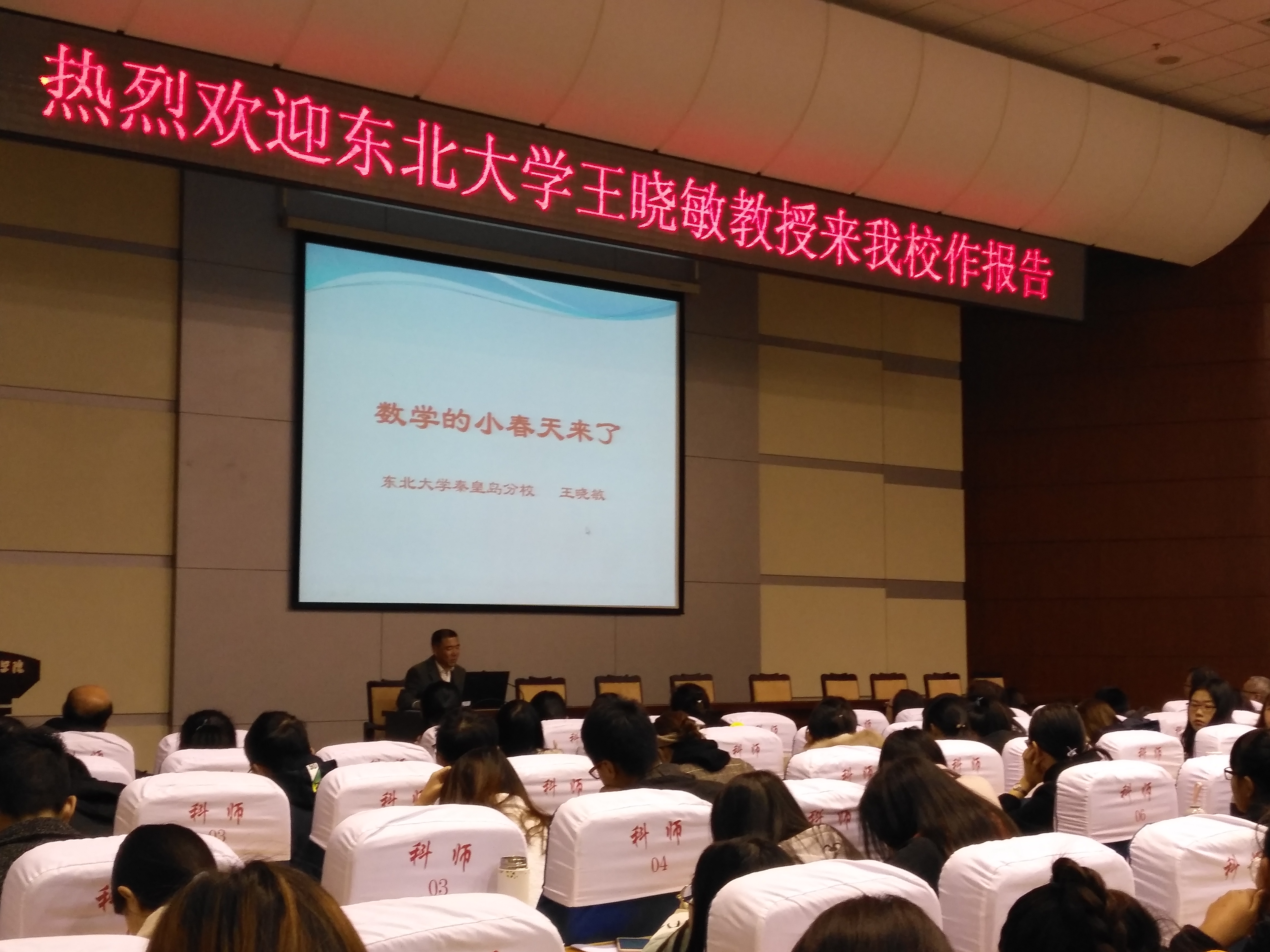 2018年10月30日上午,应beats365亚洲版官网的邀请,东北大学秦皇岛分校数学与统计公司王晓敏教授在学术报告厅作题为“从数学到人工智能--数学的小春天来了”的报告。报告会由beats365亚洲版官网行政负责人主持,公司全体数学教师及17级、18级应用统计学专业和数学与应用数学专业全体员工,以及计算机学科相关专业员工400余人聆听了报告。